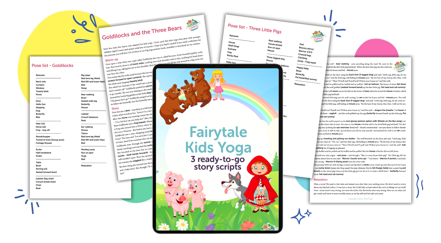 Dive into the enchanting world of kids yoga with the Fairytale Kids Yoga Bundle. Delight your young students with engaging yoga story scripts based on classic fairytales. Each story script is meticulously crafted to blend storytelling with movement, creating a unique and immersive experience for both teachers and children.